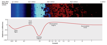 Last year in Physical Review D, Loeb and his Harvard-Smithsonian colleague Jonathan Pritchard calculated that even a relatively inexpensive single radio dish that would record the intensity of the 21-centimeter radio emission averaged over the entire sky could indicate when the first stars were born and how quickly they ionized helium and hydrogen atoms by emitting ultraviolet light or X-rays.