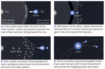 As Jupiter and Saturn traveled outward, they moved farther than ever into the frigid outer region of the solar system (though not as far out as the reservoirs of bodies that would become comets). There Jupiter and Saturn encountered an icier, water-rich population of bodies. The duo would have scattered some of this icy material into the outer part of the asteroid belt. More important for Earth, Jupiter and Saturn’s foray would have placed icy outer solar system material on elongated orbits aimed into the inner solar system. Some of the material headed inward would have bashed into Earth, baptizing the planet with water.