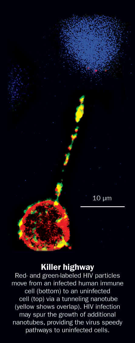 In a separate set of experiments, Eugenin’s team used HIV to infect blood cells from healthy volunteers. After a day, more of the infected cells had sprouted tunneling nanotubes than had uninfected control cells. The results suggest that once inside a cell, HIV tricks cells into making more tunneling nanotubes, through which the virus can travel and infect more cells, Eugenin and colleagues reported in the January 8 issue of Cellular Immunology.
