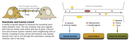 Such fast, direct communication lines can also ferry unwanted guests. Just as fast Internet connections spread computer viruses, tunneling nanotubes can carry dangerous cargo. Nanotubes can be commandeered by unfriendly forces to spread disease: Recent studies show that bacteria, viruses and infectious prion proteins can all move through the nanotubes for nefarious purposes.