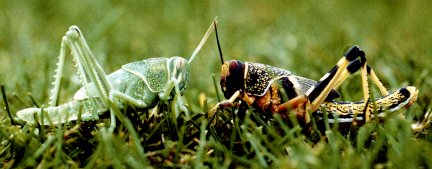 The term locust refers to grasshoppers that gather in swarms to feed. One of the most famous, the desert locust (Schistocerca gregaria) of Africa, can take either of two forms depending on environmental conditions. The mild-mannered green grasshoppers forage individually, but as food and water become abundant, the next generation turns black and yellow. Its members congregate into groups that can include more than a billion. These swarms can fly 100 kilometers in a day.