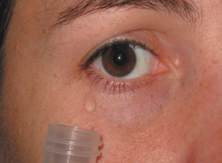 TEARJERKER A woman captures a tear in a vial while watching a sad film clip.