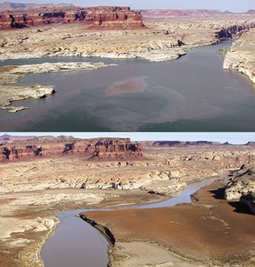 An ongoing drought that began in 2000 is driving down reservoir levels in the western United States. Utah’s Lake Powell fell more than 10 meters between June 2002 (top) and December 2003 (bottom)—a change unrelated to the different seasons depicted in the photos. Last week, the U.S. Geological Survey reported that the annual flow volume of the upper Colorado River from 2001 through 2003 averaged 6.66 cubic kilometers, barely half the average flow there during the Dust Bowl years, between 1930 and 1937. From analysis of tree rings, USGS scientists infer that the average flow rate of the upper Colorado River between 1590 and 1594—previously the worst drought in the past half millennium—was about 25 percent higher than that measured between 1999 and 2003.