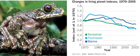 Another indicator, the Living Planet Index, averages changes in the sizes of populations of 1,686 vertebrate species. The index, put out by the World Wildlife Fund, the Zoological Society of London and their partners, slid almost 30 percent from 1970 to 2005.