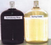 Samples of water collected downstream of a pulp mill (left) and from a neighboring unpolluted creek (right).