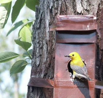 A decade of monitoring prothonotary warblers in nest boxes in southern-Illinois swamps gave Hoover the idea for the new experiment. The nest boxes sit on poles coated with axle grease to thwart raccoons, snakes, and most other raiders. Egg-laying cowbirds still strike, and Hoover had for years left the cowbird eggs alone. In 2002, he and other researchers removed cowbird eggs. Nest vandalism suddenly increased.