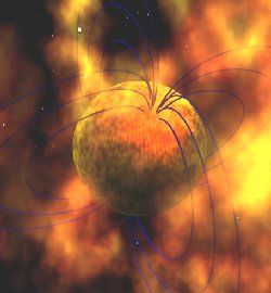 According to theory, these enormous fields–100 trillion to 1 quadrillion gauss–are generated within ultradense neutron stars. A neutron star’s gravity is so strong that it squeezes protons and electrons into a fluidlike core of neutrons inside a solid crust. Swirling motions within the core may dramatically amplify the already strong magnetic field there, creating a magnetar.