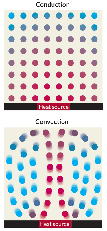 Earth’s core is a giant heat-powered engine fueled mainly by energy left over from cosmic collisions, such as the one that formed the moon about 4.5 billion years ago. As the planet gradually cools off, this primordial heat flows through the liquid outer layers that surround the solid inner core. Some of the thermal energy transfers freely from atom to atom via conduction. The material remains stationary while the heat flows through it, like a cast iron skillet warming on a stovetop. When the heat flowing through a material exceeds what the material can handle through conduction, warmer patches can rise like the heated air in a hot air balloon, creating convection. In convection, the material itself moves.