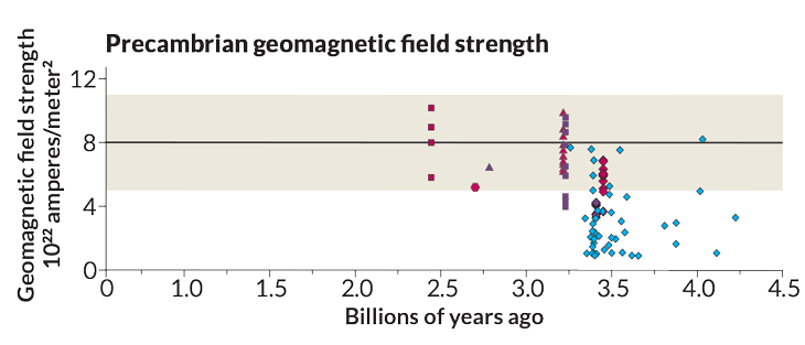 Yet the rock record shows otherwise. In July, geophysicist John Tarduno of the University of Rochester in New York and colleagues presented in Science the oldest record of Earth’s magnetic field. By measuring magnetic impurities embedded inside ancient Australian crystals, the researchers demonstrated that a relatively powerful magnetic field varying between roughly 12 to 100 percent of its present-day strength enveloped Earth from about 4.2 billion to 3.3 billion years ago.