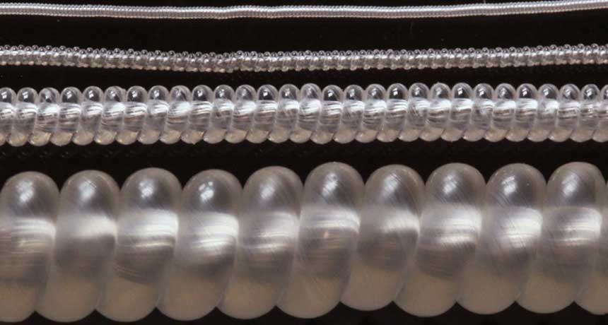 STRONG SPIRALS Tightly twisting nylon sewing thread (various diameters shown) forms corkscrews that can work as artificial muscles.