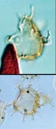 Scientists know that when the object that created this crater crash-landed east of the ancient Appalachians, sea level was higher and the impact site was located in about 300 meters of water. The seafloor sediments in place at the time contained tiny living marine organisms, called dinoflagellates, which spend part of their life cycle in a cyst buried in ocean-floor ooze. Those cysts, which are made of a waxlike material, typically have delicate protrusions.