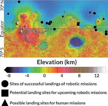 The most desirable places on Mars for human visits offer access to water in some form and are near the equator (for increased solar power and to get a boost when launching a return rocket). Rovers and landers have found evidence of a watery Martian past. Planners of future robotic and human missions have potential landing spots in mind. Map excludes polar regions.