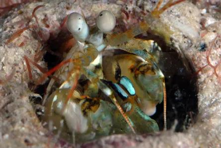 Thoen tested the color vision of mantis shrimp by training them to scoot out of their burrows toward a pair of optical fibers and punch at the one glowing a particular color. As she narrowed the color gap between the two fibers, she could tell when the animals no longer discerned a difference.