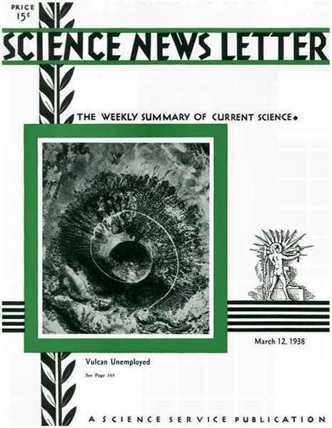 Rising high above the New Mexico plains, a cinder cone, with its surrounding lava flows, attests to the recency of volcanic activity in the area where plateau and mountains are not far apart. Caught from the air during a Department of Agriculture survey, this photograph, taken with the camera pointing straight down into the crater, shows details never visible to an observer at ground level. The white spiral line leading from the lower center to the crater rim is a road.