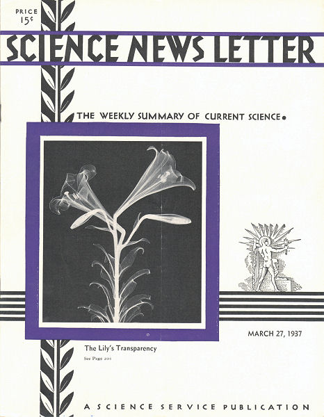 “Transparency” is a beauty often praised in white lilies, though the term is always recognized to be of figurative rather than literal application. But it is made literally true by a skilled X-ray artist, Miss Francis Mildred Davis, of Santa Monica, Calif. Arrangement of flower parts, even within the unopened buds, and the delicate veining of leaves and petals, are all brought out on her film.