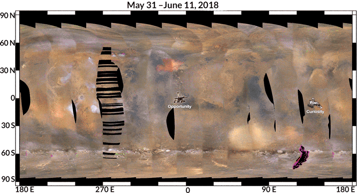 OUTLOOK HAZY NASA’s Opportunity rover took this self-portrait on Mars in December 2011, showing dust buildup on its solar panels. Now the craft is stuck in one of the worst dust storms ever seen on the Red Planet.