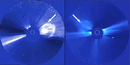 Before STEREO, many observations of solar flares came from SOHO, the Solar and Heliospheric Observatory. It orbits the sun and perpetually sits on a direct line between the star and Earth. Because SOHO looks at oncoming solar flares from one position — a spot about 1.5 million kilometers sunward from Earth — it can’t judge those flares’ speeds accurately, Kaiser said at the news conference.