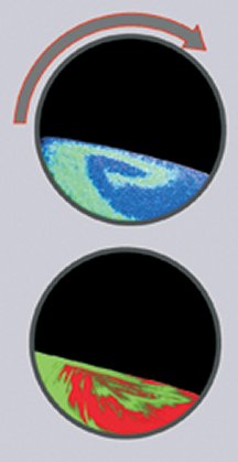 Some experiments begin by charging a tumbler with two side-by-side portions of sand-size grains that are identical except for color. As soon as the tumbler begins turning, a spiral pattern appears as grains of one color wrap around grains of the other color. Using a so-called continuum model that assumes that individual grains are vanishingly small, theorists have simulated the formation of spiral patterns and their quick onset.