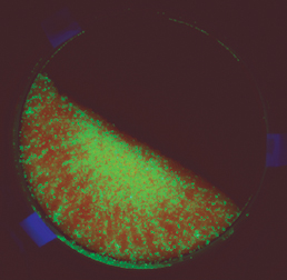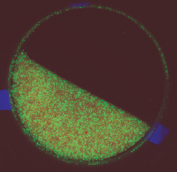 To study one of them, called radial mixing, researchers examine the effects of particle motions as seen in circular cross-sections of drums. One way they do this is by stopping the rotating tumbler and then hardening a drum’s contents with glue–freezing the particles in place. Next, they cut through the drum perpendicular to its axis of rotation. The distribution of ingredients reveals how particles travel in that plane.