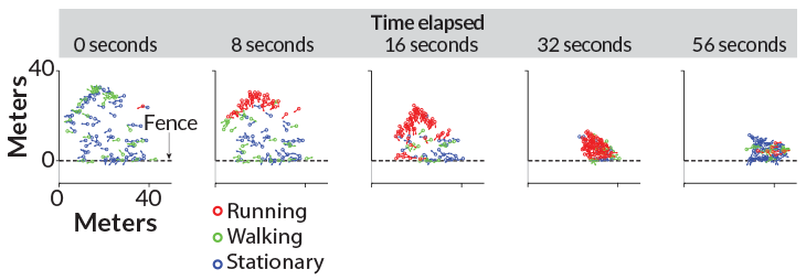 One sheep can prompt a spread-out herd of Merino ewes to quickly clump together, as shown in this representation of one such packing event. Running sheep are displayed in red, walking sheep in green, and standing sheep in blue.
