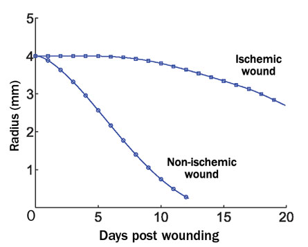 The model’s simulations agreed with wound healing times found in experiments, the authors say. An eight-millimeter–wide wound under normal conditions is predicted to completely heal in about 13 days. But an ischemic wound would be only 25 percent healed after 20 days. The model also predicts that under low-oxygen conditions, fewer white blood cells can reach the wound.