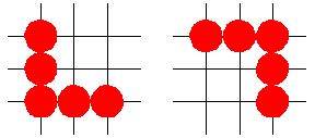 You have five pennies arranged on a square grid so that they all touch at least one other penny and form an “L” (above left).