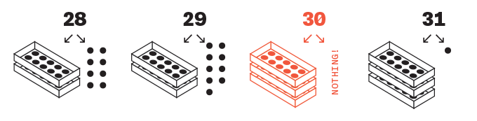 Think of our familiar system as a series of boxes. You can leave up to nine loose objects unboxed. But if a tenth object arrives, you must pack the ten into a box. When this happens, we use zero to denote an absence of loose objects. The numeral 30 means three boxes of ten, and no additional objects.