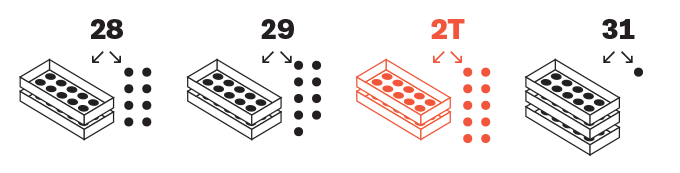 Foster’s system, you might say, asks us to wait before boxing. We leave ten objects loose, writing them as T. Thus, 30 becomes 2T: two boxed-up tens plus another ten, this one unboxed. (An apter name might be “twenty-ten.”) Only with another object (the 31st) does boxing become necessary.