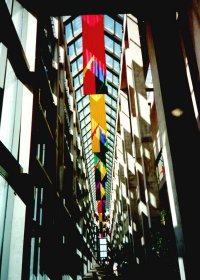 One breath-taking vista within the gallery was a long corridor with a sloping walkway and a high ceiling. Nine banners with the same pattern but different color arrangements hung down from the colonnade’s ceiling. Each banner had five regions, so one of the four colors available (red, yellow, blue, and green) was always used twice.
