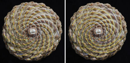 “What’s interesting about this is that the pattern that actually forms would be hardly distinguishable from the one where the angle was the same,” Hotton says. “You could actually see opposing pairs of spirals. You could count them and see that there were [for example] five in one direction and eight in the other. But the angles wouldn’t be the same every time: It would be following this periodic sequence.”