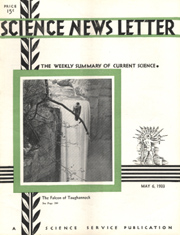 Rarely is a perfect bird photographed against so perfect a background as the duck hawk, or American falcon, shown on the front cover of this issue of the Science News Letter. The photograph is by Dr. A.A. Allen of Cornell University, and the magnificent cataract plunging in the background is Taughannock Falls, one of the greatest of the scenic beauties of New York State.