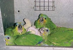 SCARY STUFF? Young, hand-raised orange-winged Amazons cope with novelty better initially than parent-raised birds do. Fox