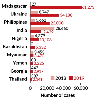 One of the poorest countries in Africa, Madagascar leads the world in measles cases, with more than 61,000 from January through March 2019 — a huge rise from just 27 total infections in the first three months of 2018. Less than 60 percent of the total population is vaccinated, and the country only requires a single dose of the vaccine.