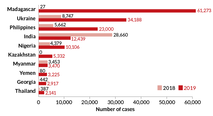 Some countries hardest hit by measles in the first three months of 2019 had very few cases the year before, according to provisional WHO data posted May 15, 2019.