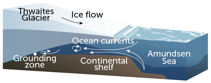 Thwaites Glacier and most of the West Antarctic Ice Sheet sit on a gravelly bed that is hundreds of meters below sea level — making the ice vulnerable to warm, salty ocean currents that hug the seafloor. Thwaites is especially vulnerable because parts of its grounding zone (where it lifts off its bed and floats on the ocean) sit as far as 1 kilometer below sea level, exposing it to the warmest water.