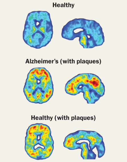 Yet caution is needed when interpreting a PiB-positive or PiB-negative brain scan, especially when considering estimates that 20 to 50 percent of healthy people go about their business with brains chock-full of A-beta plaques. Many of those fully functional brains would easily earn an Alzheimer’s diagnosis with PiB scanning. It’s not clear whether, if people were to live long enough, anyone walking around with A-beta plaques in the brain would eventually succumb to Alzheimer’s.