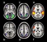 Images of brain show areas that become most active during perception of pictures (a and c, in green) and sounds (e, in yellow).