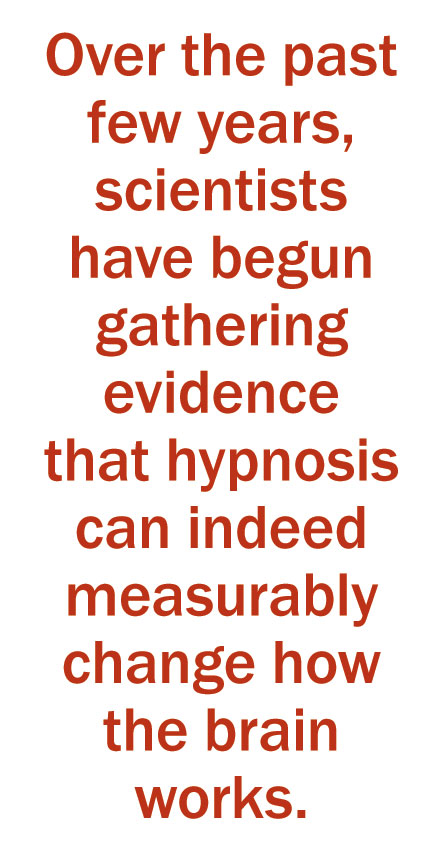 Other scientists, intrigued by the many practical uses of hypnosis, are striving to figure out how it works. Using the latest neuroimaging tools, these scientists are getting a look at what goes on in the hypnotized brain. The findings are mesmerizing.