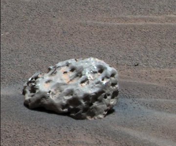Scientists have dubbed the meteorite Heat Shield Rock because it lies near debris from Opportunity’s heat shield in Meridiani Planum, the cratered plain where the rover landed on Jan. 24, 2004. Metal-rich meteorites are relatively rare on Earth, and scientists have hypothesized that Mars is also bombarded by many more rocky meteorites than metallic ones, notes Squyres. Other clumps of material seen at the surface of Meridiani Planum may be rocky meteorites, he suggests.