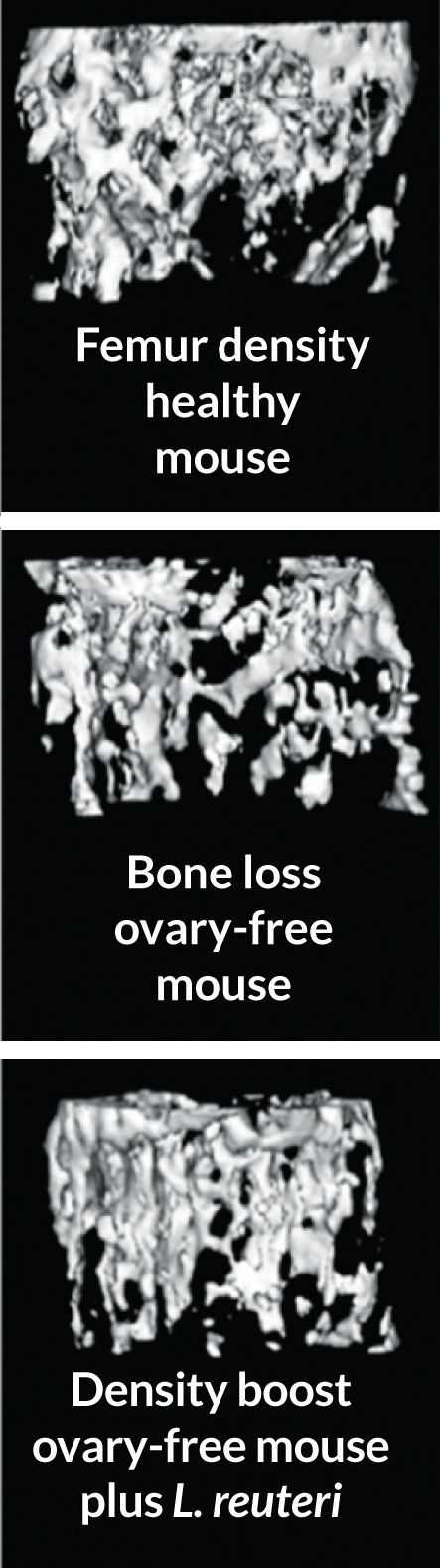 L. reuteri also prevents bone loss in certain female mice, the group reported in the November Journal of Cellular Physiology. L. reuteri suppresses the rapid loss of bone that occurs when mice have their ovaries surgically removed to simulate menopause. The bone loss is caused by inflammation within the bone marrow. It occurs at low levels in men and women, but accelerates in women as they age, especially after menopause.