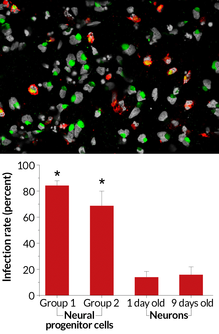 For her Cell Stem Cell study, Ming and colleagues grew different types of human cells in the lab, and then gave them a dose of Zika. The virus went wild in neural progenitor cells (a critical part of the embryonic brain), infecting up to 90 percent of cells in a dish. But Zika floundered in more developed brain cells, infecting less than 20 percent or so of dosed cells.