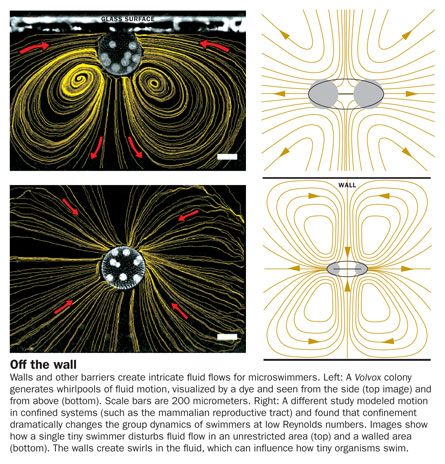 In addition to the honey consistency of life at low Reynolds numbers, all tiny swimmers must contend with powerful influences created by fellow swimmers and walls or other edges. “You can get interesting hydrodynamic effects and long-range interactions that are particularly strong,” Goldstein says.