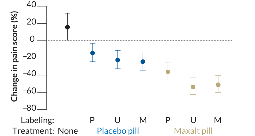 In a new study, migraine patients experienced the greatest decline in pain when placebo pills (blue) and Maxalt pills (brown) were labeled as “Maxalt” (M) or “Maxalt or placebo” (U). Pills labeled “placebo” (P) were the weakest painkillers in each treatment condition. Between 30 minutes and 2.5 hours after an attack started, migraine pain increased among patients who got no treatment at all (black).