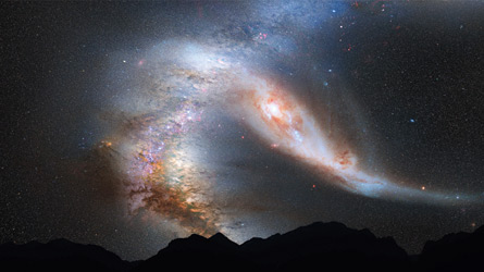 Assuming Earth is still here in 4 billion years, its skies will be spangled with the glowing shards of an epic cosmic collision. The Milky Way galaxy and its nearest neighbor, the enormous Andromeda galaxy, will plow right into one another (photo illustration, above, shows a view of Earth’s night sky during an early stage of the predicted galactic smashup). Earth’s solar system will be punted from its perch in the Milky Way’s Orion spur, drift for a while and probably end up orbiting much farther from the new galactic core, scientists from the Space Telescope Science Institute in Baltimore and colleagues reported in May (SN: 7/14/12, p. 10). Using the Hubble Space Telescope to measure the movement of stars in Andromeda, the team determined that the galaxy is heading straight for the Milky Way — at nearly 400,000 kilometers per hour. Though the galaxies are still 2.5 million light-years apart, gravitational attraction is pulling them together. The researchers speculate that another nearby galaxy — M33, the Triangulum — may get dragged into the pileup. Either way, the merger should be a spectacular sight for cosmic rubberneckers.