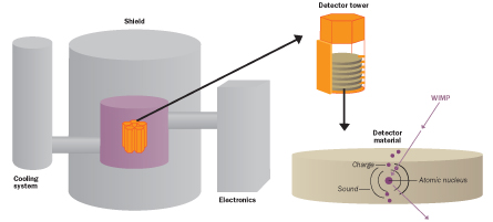 At Soudan and other underground laboratories, scientists use ultrapure solid crystals or liquefied noble gases to try to record the rare collision of a WIMP with an atomic nucleus. Like a struck billiard ball, the jostled nucleus travels a short distance in the detector, hitting neighboring nuclei or electrons. In a solid, like a germanium crystal, the motion of the nucleus generates sound waves that reverberate throughout the detector and cause a tiny but detectable rise in temperature. The interaction of the nucleus with its neighbors also ionizes atoms, liberating some of their outermost electrons. Some experiments measure a different signal, the emission of light generated by a collision.