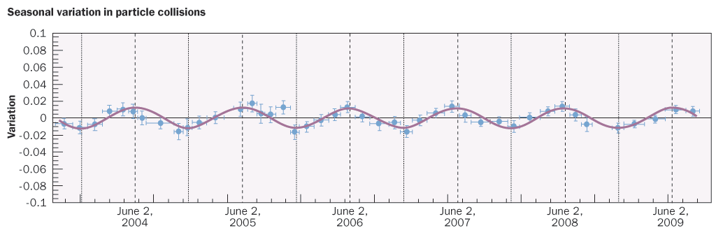 The experiment sidesteps the problem of contamination from ordinary background particles by looking for a variation in the number of particle collisions it records over a year. A collision rate that is higher in summer than in winter could be a sign that Earth is plowing through a WIMP wind during half its annual trip around the sun. DAMA/LIBRA has seen just such a seasonal increase for more than a decade (SN: 5/10/08, p. 12); researchers recently reported the latest results online at arXiv.org/abs/1007.0595.