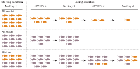 Each personality type gets some form of bonus when it’s rare, but benefits dwindle when the type becomes too common. If social fish are rare, just about any individual they try to buddy with will probably be a loner, prone to discovering new food patches. So social fish should grow and prosper in a largely loner world, Fogarty says. Conversely, a loner fish should have an advantage when social types abound because types that club together fail to cover maximum ground, leaving plenty of food patches for a loner to discover.