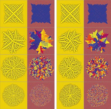 He and his colleagues at the Research Institute for Solid State Physics and Optics in Budapest found that in their model, the position and orientation of a particle can make the polycrystal growth veer in a new direction, creating a branch point. Therefore, the more dirt particles it encounters, the greater the randomness of the branching structure. The researchers dub polycrystals that follow these branching growth patterns “dizzy dendrites.”