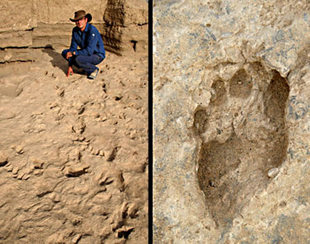 Three footprint trails appear on the upper sediment layer — two trails of two prints each and one of seven prints. Another six isolated prints dot the surface. On the lower layer, the researchers found one trail of two prints and a single, relatively small print that was probably made by a young individual. A variety of four-legged animals also left footprints on this layer.