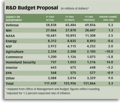 This week, President Bush released the details of his proposed $2.4-trillion federal budget for fiscal year (FY) 2005, which begins Oct. 1, 2004. Of that figure, nearly $132 billion will go to research and development—an increase of 3.3 percent over last year’s figure after accounting for the expected rate of inflation—but many science programs are seeing little or no rise in funding. The modest overall proposed growth in R&D funding comes as the federal government attempts to rein in an all-time-high deficit of $521 billion.